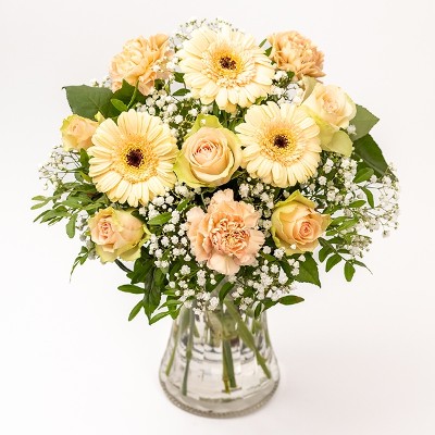 En herlig ferskenfarget bukett med blomster som nelliker, germinis og roser. Med sine lyse ferskentoner er dette en bukett som imponerer. Perfekt for alt du vil feire. Buketten er et eksklusivt blomsterhåndverk, og blomstene er nøye utvalgt for å sikre høy kvalitet. Hver bukett er unik og bindes ut fra sortiment og sesong – men beholder alltid sin farge og form. Buketten leveres personlig av din lokale dekoratør.
