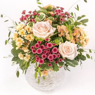 En stilren vårbukett med blomster som roser, santinis og statice sammen med sesongens grønne. Bukettens blekrosa nyanser står i vakker kontrast til mørkrosa detaljer og nyanser i fersken. Perfekt til bursdager, viktige jubileer og alt annet du vil feire. Buketten er et eksklusivt dekoratørhåndverk, og blomstene er nøye utvalgt for å sikre høy kvalitet. Hver bukett er unik og bindes ut fra sortiment og sesong – men beholder alltid sin farge og form. Buketten leveres personlig av din lokale blomsterdekoratør.