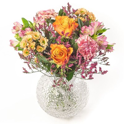 Vakker bukett i rosa og aprikostoner. Den inneholder blomster som roser, nelliker og santinis sammen med sesongens grønne. Perfekt når du vil overraske stort til en liten pris. Buketten er et eksklusivt blomsterhåndverk der hver blomst er nøye utvalgt for å sikre høy kvalitet. Hver bukett er unik og bindes ut fra sortiment og sesong – men beholder alltid sin farge og form. Buketten leveres av din lokale dekoratør.