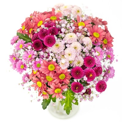 Bukett med blomster som santini, roser og krysantemum sammen med sesongens grønne. Med sine pastellfarger i rosa, lilla og aprikos er denne buketten en uforglemmelig overraskelse. Perfekt for alt du vil feire. Buketten er et eksklusivt blomsterhåndverk, hvor blomstene er nøye utvalgt for å sikre høy kvalitet. Hver bukett er unik og bindes ut fra sortiment og sesong – men beholder alltid sin farge og form. Buketten leveres av en lokal blomsterdekoratør.