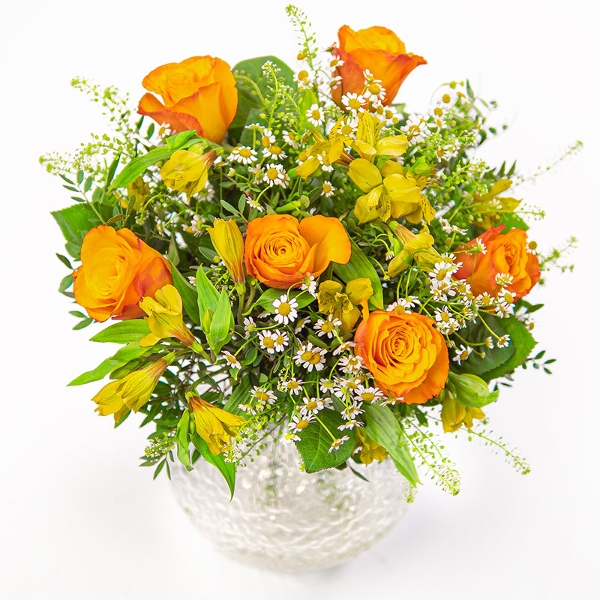 Vårens favoritt er en søt bukett med blomster som oransje roser, hvit matricaria og gul alstromeria sammen med sesongens grønne. Med sine herlige gule nyanser er denne buketten en ekte gledesspreder – perfekt for alle anledninger du vil feire i vår. Buketten er et eksklusivt floristhåndverk, og blomstene er nøye utvalgt for å sikre høy kvalitet. Hver bukett er unik og bindes ut fra sortiment og sesong – men beholder alltid sin farge og form. Buketten leveres personlig av din lokale florist.